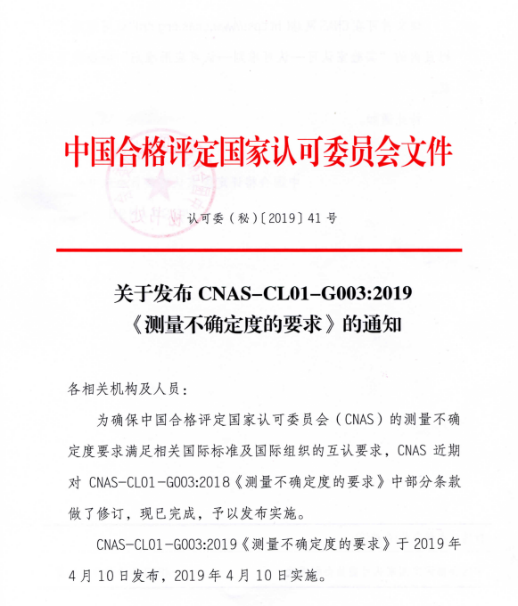 为确保中国合格评定国家认可委员会(CNAS)的测量不确定度要求满足相关国际标准及国际组织互认的要求,CNAS近期对CNAS-CL01-G003:2018《测量不确定度的要求》中部分条款做了修订。CNAS-CL01-G003:2019《测量不确定度的要求》于2019年4月10日发布,2019年4月10日实施。