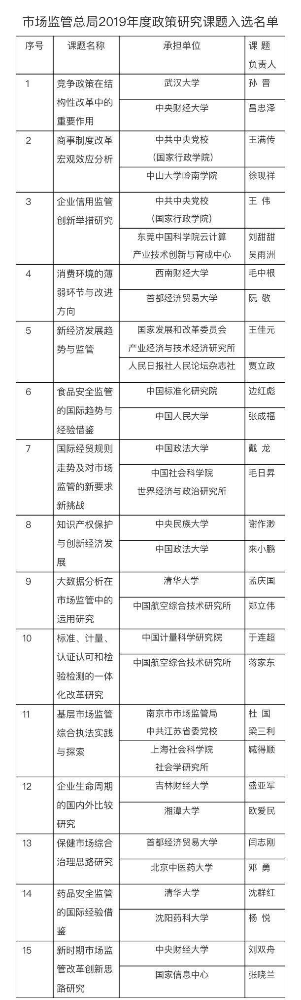 2019年3月7日,市场监管总局综合规划司公开发布《市场监管总局2019年度政策研究课题征集公告》,提出15个招标课题。