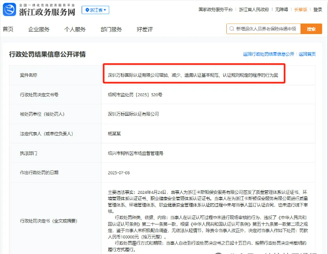 据浙江省政务服务网公示,浙江卡斯顿保安服务有限公司因在进行质量管理体系、环境管理体系、职业健康安全管理体系认证的过程中未制定质量手册、程序文件、内审和管理评审等体系文件,未与深圳万标国际认证有限公司签订认证合同,也未进行线下审核。该涉事企业被罚30000元。这也是涉及认证机构和企业,在认证过程中双双受罚的罕见案例。