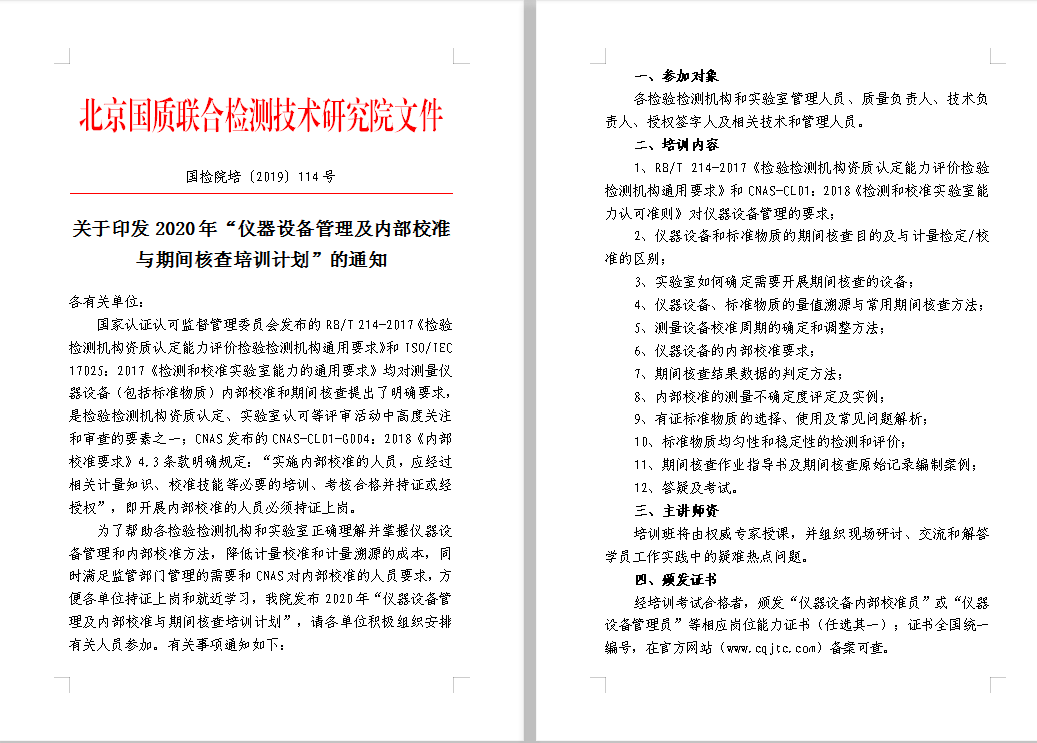 国家认证认可监督管理委员会发布的RB/T 214-2017《检验检测机构资质认定能力评价检验检测机构通用要求》和ISO/IEC 17025:2017《检测和校准实验室能力的通用要求》均对测量仪器设备(包括标准物质)内部校准和期间核查提出了明确要求,是检验检测机构资质认定、实验室认可等评审活动中高度关注和审查的要素之一;CNAS发布的CNAS-CL01-G004:2018《内部校准要求》4.3条款明确规定:“实施内部校准的人员,应经过相关计量知识、校准技能等必要的培训、考核合格并持证或经授权”,即开展内部校准的人员必须持证上岗。为了帮助各检验检测机构和实验室正确理解并掌握仪器设备管理和内部校准方法,降低计量校准和计量溯源的成本,同时满足监管部门管理的需要和CNAS对内部校准的人员要求,方便各单位持证上岗和就近学习,我院发布2020年“仪器设备管理及内部校准与期间核查培训计划”,请各单位根据工作安排有关人员参加。有关事项通知如下: