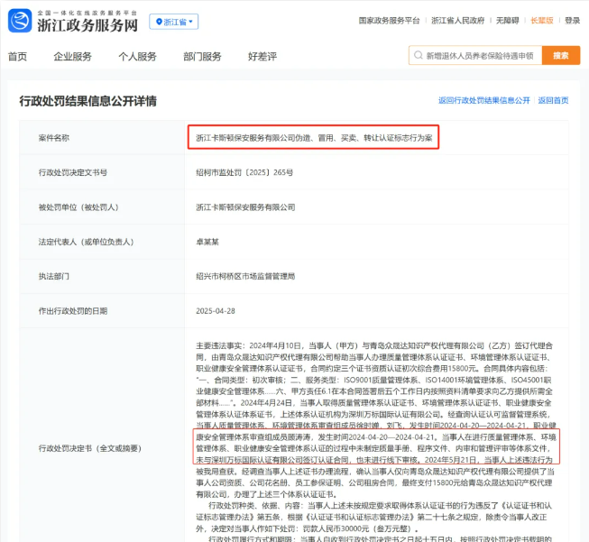 据浙江省政务服务网公示,浙江卡斯顿保安服务有限公司因在进行质量管理体系、环境管理体系、职业健康安全管理体系认证的过程中未制定质量手册、程序文件、内审和管理评审等体系文件,未与深圳万标国际认证有限公司签订认证合同,也未进行线下审核。该涉事企业被罚30000元。这也是涉及认证机构和企业,在认证过程中双双受罚的罕见案例。