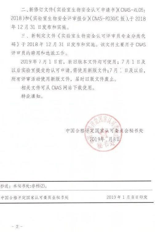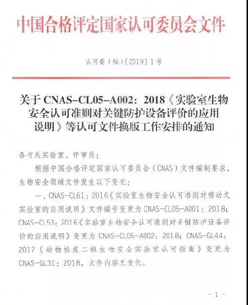 1月8日,中国合格评定国家认可委员会(CNAS)发布了CNAS-CL05-A002:2018《实验室生物安全认可准则对关键防护设备评价的应用说明》等认可文件换版工作安排的通知。2019年7月1日前,新旧版本文件均可使用;7月1日及以后,实验室提交的认可申请及所有评审活动均需使用新版文件。
